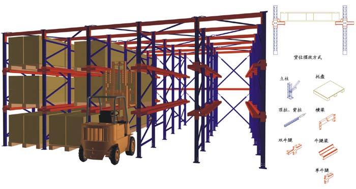 贯通式货架由于储存的货物比较密集,稳固性要求极高,因此所需要的货架配件相对较多,通过配件与货架立柱片的连接,令货物能安全密集地存放在牛腿梁上,最大程度地利用空间。驶入式货架的配件包括:牛腿(牛腿梁与货架立柱的主要连接件,分单面与双面)、牛腿梁(货物存放的主要支承搁层)、顶梁(货架立柱的连接稳固件)、顶拉(货架立柱的连接稳固件)、背拉(货架立柱的连接稳固件,用于货架单向排布时)、护脚(货架正面保护件)、护轨(叉车进入巷道时货架保护件)等。贯通式货架使用方法