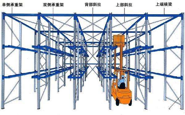 驶入式货架的配件包括:牛腿、牛腿梁、顶梁、顶拉、背拉、护脚、护轨等。
