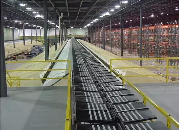滑块式分拣机也是在快递行业应用非常多的一种分拣机。滑块式分拣机是一种非常可靠的分拣机,故障率非常低,在大的配送中心,比如UPS的路易斯维尔,就使用了大量的滑块式分拣机来完成预分拣及最终分拣。滑块式分拣机可以多台交叉重叠起来使用,以满足单一滑块式分拣机无法达到能力要求的目的。