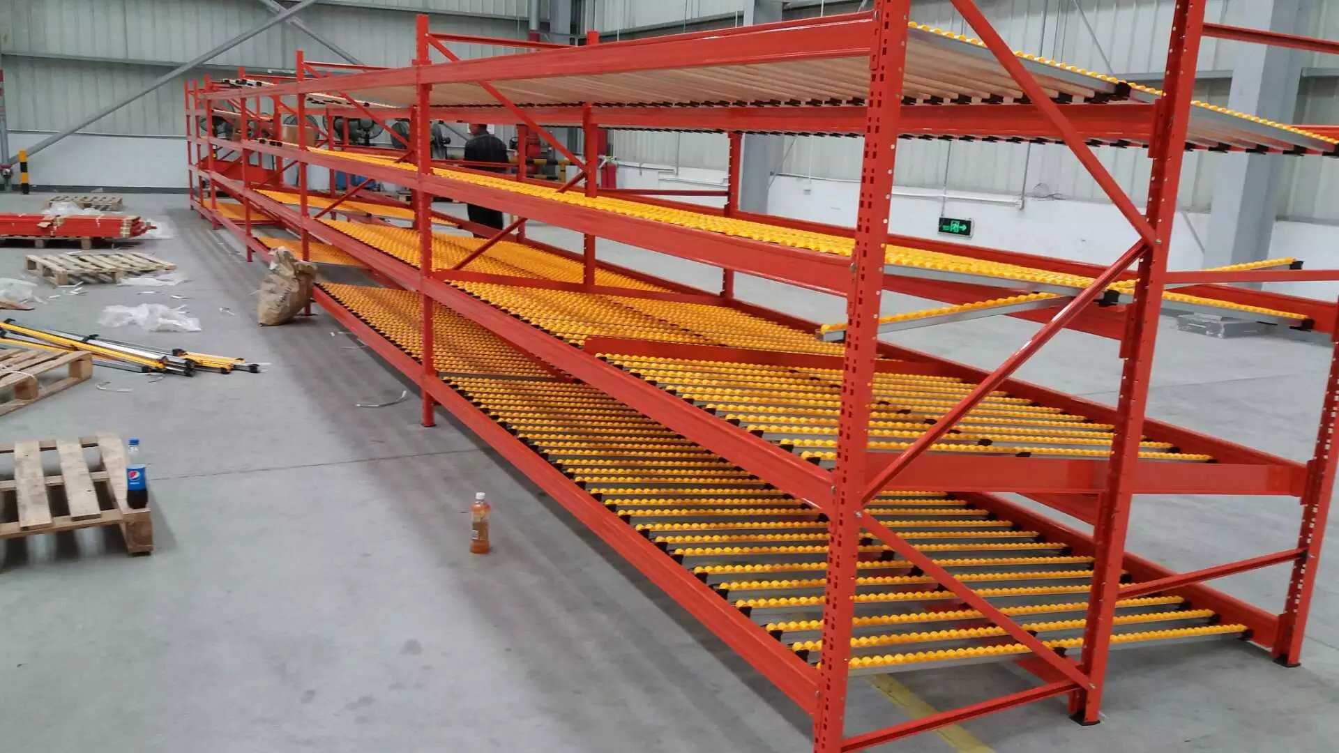 重力式货架相对普通托盘货架而言不需要操作通道,故增加60%的空间利用率;托盘操作遵循先进先出的原则;自动储存回转;储存和拣选两个动作的分开大大提高输出量,由于是自重力使货物滑动,而且没有操作通道,所以减少了运输路线和叉车的数量。在货架每层的通道上,都安装有一定坡度的、带有轨道的导轨,入库的单元货物在重力的作用下,由入库端流向出库端。这样的仓库,在排与排之间没有作业通道,大大提高了仓库面积利用率。但使用时,最好同一排、同一层上的货物,应为相同的货物或一次同时入库和出库的货物。层高可调,配以各种型号叉车或堆垛机,能实现各种托盘的快捷存取,单元货格最大承载可达5000kg,是各行各业最常用的存储方式。