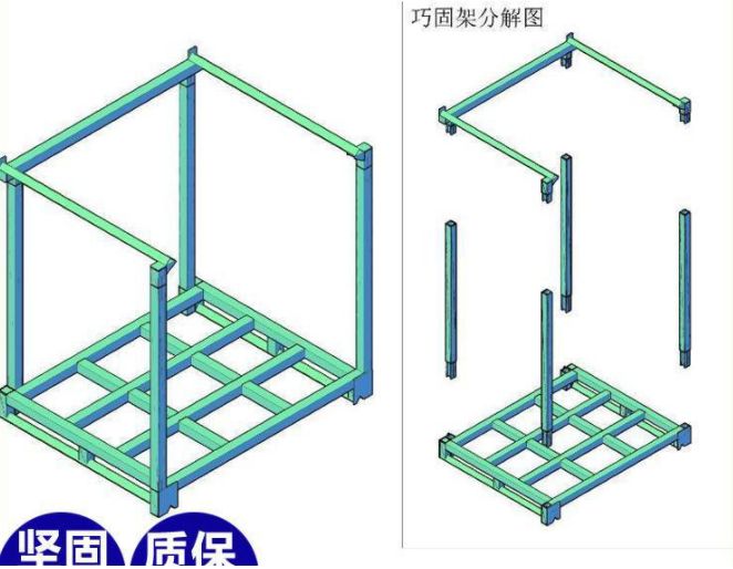 巧固架又称堆垛架规格统一,容量固定,存放货物一目了然,易于仓库的清点,货架可互相堆高,实现立体化存储,很容易形成立体存储的能力,而不需要借助于货架等设备。适用于在如租赁仓库,低矮的老式仓库或车间暂存区等不适合投资仓库的区域。