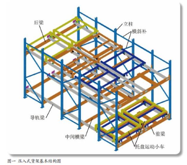 压入式货架又称为后推式货架,其储存的货物存放于专门制造的托盘小车之上,托盘小车通过前低后高有一定斜度的导轨实现自滑功能。存放货物时利用叉车将货物从导轨较低的一端存放于托盘小车之上,接着叉车再用下一个托盘推着前一个托盘进入一个深位,以此类推;