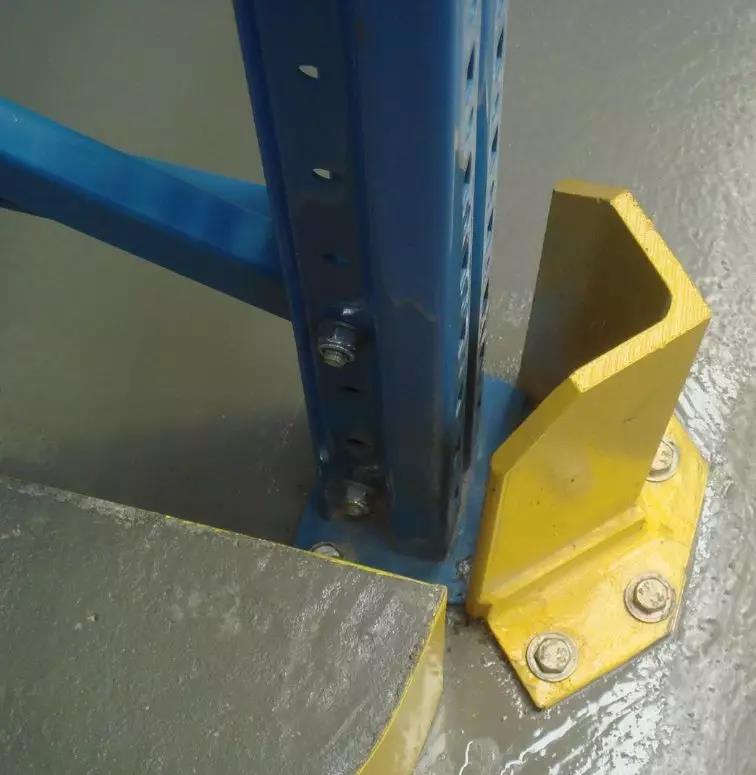 639条 在可能受到叉车或其他车辆撞击的货架位置应设置防护措施。一般而言,撞击损坏发生在货架底部,应使用可更换的立柱护脚降低撞击损坏风险。一排货架的角部立柱受到撞击的风险更大,因此应设置颜色明显的防护装置。