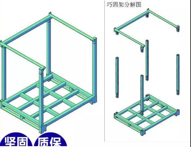 巧固架又称堆垛架规格统一,容量固定,存放货物一目了然,易于仓库的清点,货架可互相堆高,实现立体化存储,很容易形成立体存储的能力,而不需要借助于货架等设备。适用于在如租赁仓库,低矮的老式仓库或车间暂存区等不适合投资仓库的区域。