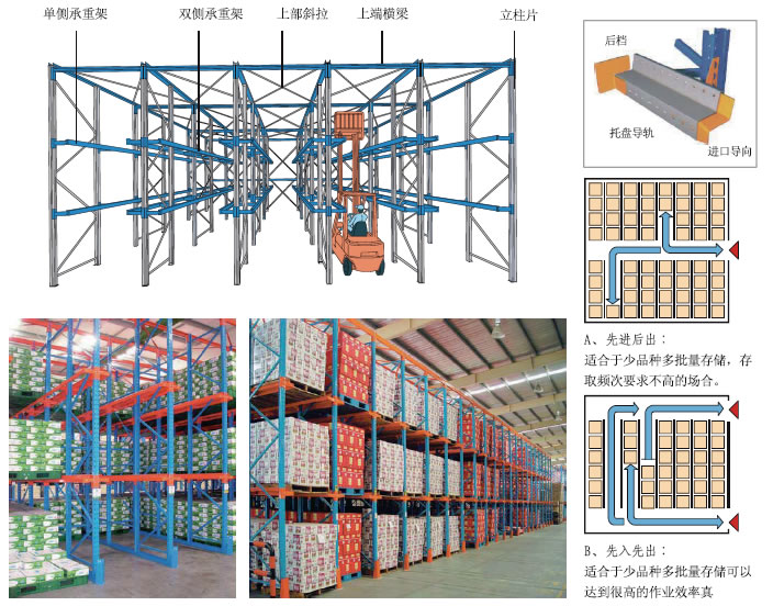驶入式仓储货架,又叫贯通式货架或通廊式货架,是一种不以通道分隔的整栋式货架,与普通横梁式货架相比,减少了叉车通道,使得空间利用率更高。与其它密集型货架相比,配套使用的是前移式叉车或平衡重式叉车,系统造价相对较低。